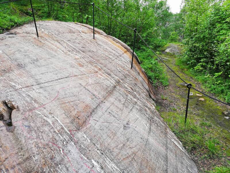 In the city of Narvik is located a beautiful carving of a reindeer upon the flat, glaciated face of a rock outcrop, in a small area of birch forest. The site is not located far from Narvik train station, and is known as Brennholtet. This petroglyph is very beautiful in my opinion. I did not know about it the first times I went to Narvik, but later on I visited it on two occasions, both in summer. In summer, this site is wonderful, when the sun is out, and the wind is blowing through the birch trees, playing their leafs like notes. Often there are many wood ants on the ground in such areas, but they are cool too, but best avoided.