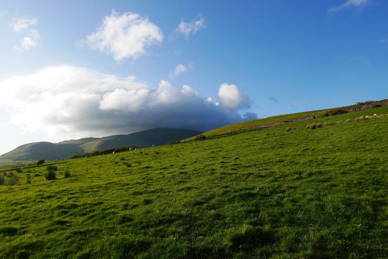 Photo below: a dramatic summer evening view from the hill/mountain of Lacra Bank, and its green slopes, with the mountain of Black Combe behind, its summit slightly in cloud. I think that the photo below gives some impression of the imposing, magical and ancient feeling of this place, a feeling which seems to go beyond time. Certainly when I look at the clouds over Black Combe in the photo below, I feel I am looking upon a scene as ancient and connected to those ancient people as it is to my own existence and time.